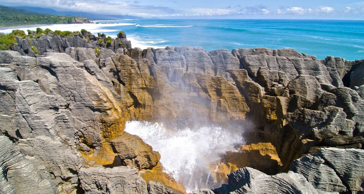 • Take a coastal tour to Punakaiki, home of the fascinating Pancake Rocks and National Park. Watch the roaring sea geysers heave their way up from the Ocean throught the rock Blowholes. Take a guided Rainforest walk and learn about the Maori foods and medicines om the forest, visit a secluded beach to find your own peice of NZ Jade.