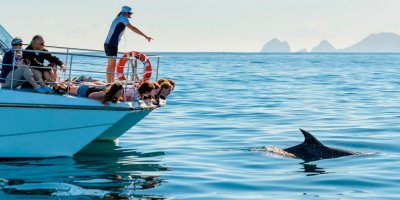 • The Bay of Islands has the warmest waters in New Zealand, perfect for swimming with dolphins.    Delight in watching the dolphins as they interact with the vessel.  You are welcome to jump in and swim with the playful dolphins, or just watch and capture photos from the deck.