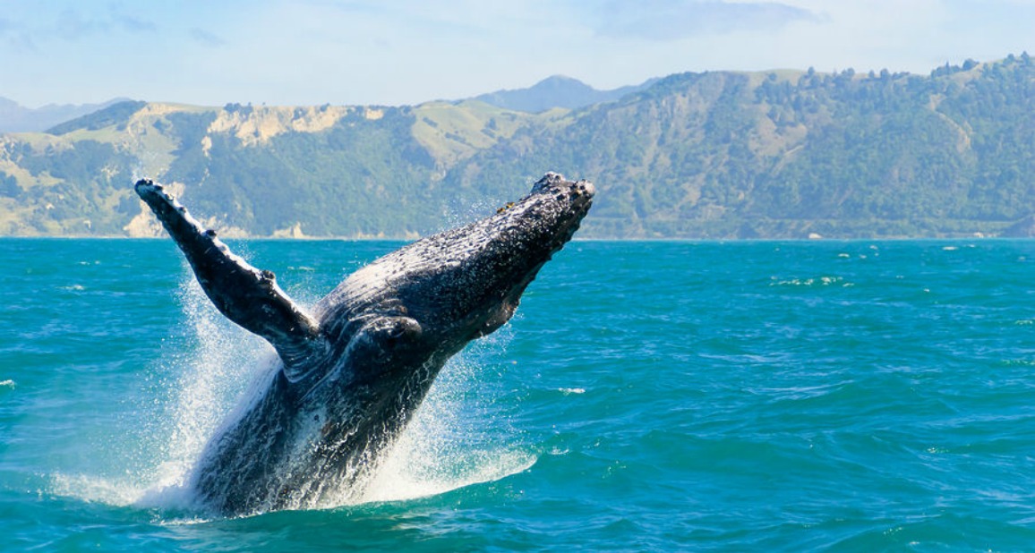 Observe the mighty whale leap out of the water in preparation for his dive below to feed.